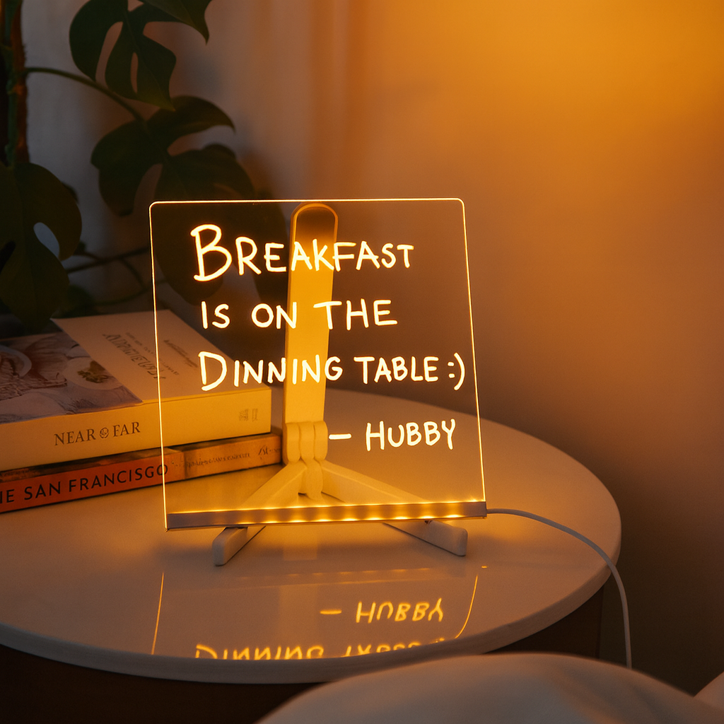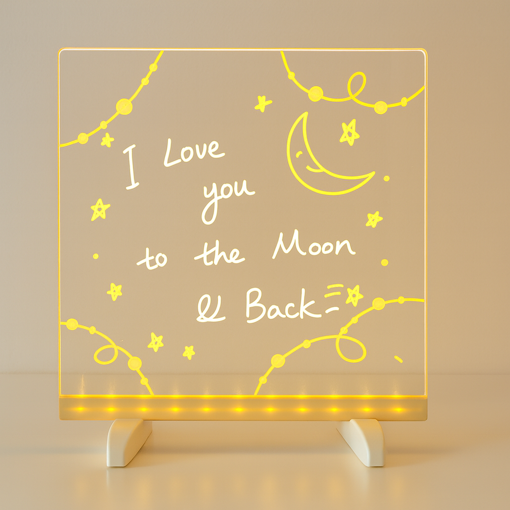 En skrivbar, upplyst tavla som får varje meddelande, teckning eller kreativ idé att glöda – bokstavligt talat. Den skapar en atmosfär som både motiverar och väcker uppmärksamhet. Perfekt i hemmet, på kontoret eller som skylt i butik.